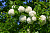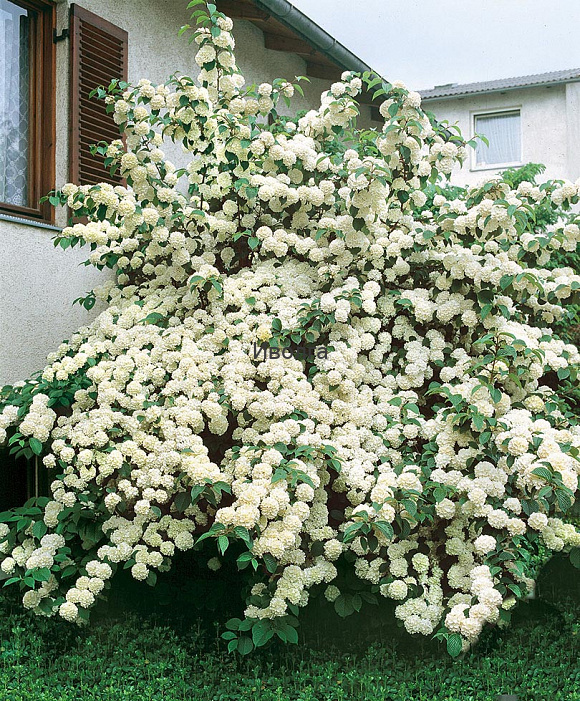 Яйцевидные крупные листья по краям зазубрены. Весной и летом они имеют светло-зеленый окрас, а вот по осени становятся красно-розовыми. Цветет эта калина в июне, весь процесс длится от 2 до 4 недель. В это время на кустарнике формируются крупные, до 10 см размером, соцветия, имеющие плотную структуру и шаровидную форму. В первые дни цветы зеленоватые, затем они приобретают снежно-белый окрас. Отцветающие экземпляры розовеют.